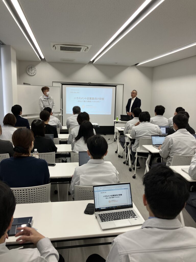 2月25日 社会保険労務士法人ワークデザイン 蓑輪 寿宏 先生による 誰もが安心して働ける職場づくりを目指し 従業員向け と 管理職向け の2部構成にて 全社員を対象とした『ハラスメント研修』を実施いたしました。 研修では、ハラスメントの種類や定義について解説いただいたほか ケーススタディによる事例を交え 日常のコミュニケーションで気を付けるポイントや 管理職として求められる対応について学びました。 今回の学びを活かし 互いに尊重し合える 働きやすい職場づくりに引続き取り組んでまいります。 PrevNext
